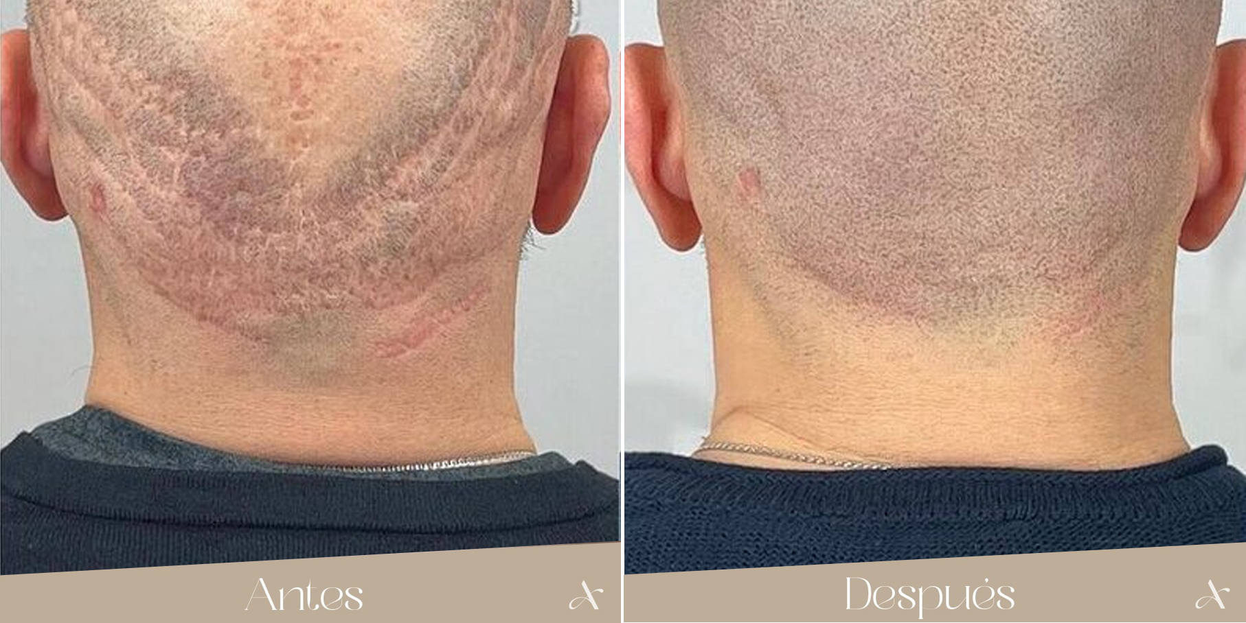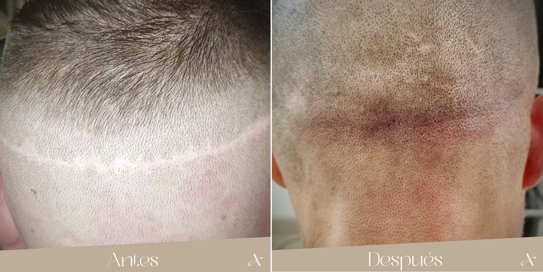 Las cicatrices pueden tener diversos orígenes: antiguas técnicas de injerto capilar como FUSS o tira, intervenciones quirúrgicas, accidentes o cualquier otro factor que haya dejado marcas visibles en el cuero cabelludo. La micropigmentación capilar permite disimular estas imperfecciones con un efecto visual totalmente natural. Gracias a la precisión de la técnica y la habilidad profesional, logramos que las cicatrices queden prácticamente imperceptibles, restaurando una apariencia uniforme y sin irregularidades.